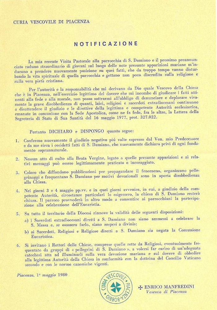 nel 1980 il vescovo di Piacenza, Mons. Enrico Manfredini, ha ribadito il suo giudizio negativo, già espresso dal suo predecessore, dichiarando che gli avvenimenti di San Damiano non hanno alcun fondamento soprannaturale. Inoltre ha ammonito che chi diffonde materiale su tali eventi ed organizza pellegrinaggi a questi collegati, agisce in aperta opposizione alla Chiesa. Conferma del giudizio negativo da parte della Curia Vescovile di Piacenza datata il 7 giugno 2005.
