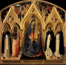 b) La Vergine trova grande risalto nelle opere del Beato Angelico, sempre soffusa di grande spiritualità e dolcezza. Tutti i momenti significativi della vita di Maria e di Cristo e la sua presenza nella Chiesa, significata dai Santi accanto a Lei, trovano spazio e descrizione, sempre soffusi di denso significato teologico e biblico. Per questo, le sue Madonne spirano devozione a chi le rimira, spingono alla preghiera, secondo l'iscrizione che si legge in S. Marco di Firenze: « Virginis intactae cum veneris ante fìguram - Praetereundo, cave ne sileatur Ave ».