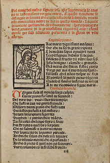 A te con le mani gionte ingenochiato  è l'incipit del cap. XII: si parla delle gioie della Vergine e si loda tutto ciò che ha partecipato a renderla gaudiosa. Una specie di Cantico delle creature, nello spirito di Francesco.