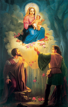 L’apparizione della "Madonna delle Rose" avvenne la notte del 4 Gennaio 1417, allorché due ricchi mercanti romagnoli, che andavano a Bergamo per commerci, furono sorpresi dal buio nel bosco di Albano e smarrirono la strada. Alle loro fervorose invocazioni apparve la Vergine che li rassicurò ed accompagnò fin fuori dal bosco, sulla strada per Bergamo. I due fortunati veggenti si recarono tosto dal Vescovo e gli depositarono un’ingente somma di denaro perché sul posto della celeste apparizione venisse costruita una Chiesa.