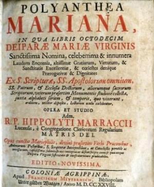 Ippolito Marracci fu un grande precursore dell’era mariana, un fecondo teologo dal grande spessore culturale, dalle profonde intuizioni e, soprattutto, un indefesso difensore del dogma dell’Immacolata Concezione. Egli scrisse un impressionante numero di opere mariologiche non ancora tutte edite, attraverso le quali intese dar voce alla viva tradizione della Chiesa a riguardo della Madre del Signore. Ben 115 opere sono quelle conosciute, di cui 32 date alle stampe, 52 rimaste manoscritte e 31 smarrite. Tra i tanti titoli ricordiamo: Pontifices Maximi mariani  (1642), Apostoli mariani (1643), Fundatores mariani (1643), Lilia mariana (1561), Purpura mariana (1654), Reges mariani (1654), Caesares mariani (1656), ecc. L’opera più consistente  e più nota rimane la Biblioteca mariana alphabetico ordine digesta del 1648. Una delle sue opere, Polyanthea mariana in libris XVIII distributa, Sumptibus Petri Ketteler, Colonia 1683, ebbe un grande successo editoriale come strumento per la predicazione mariana, il nutrimento spirituale dei fedeli, la composizione di altre opere affini. Dopo la pubblicazione postuma del 1683, cui si aggiunse l’Appendix ad Bibliothecam Marianam, seguí l’anno successivo una nuova edizione. Nel 1694 il fratello Ludovico Marracci curò un’edizione in 20 volumi, e non in 18. Nel 1710 vide la luce una nuova edizione a Colonia, presso F. Metternich. Sucessivamente, di nuovo a Colonia, si segnalano altre due edizioni degli anni 1727 e 1728. L’ultima edizione della Polianthea si ebbe a Napoli nel 1733. Fu ristampata da J. Bourassè nella sua Summa aurea, tomo IX, cc. 851-1512 e tomo X, cc. 9-595.