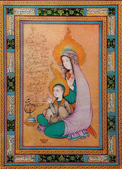 c) Scene della vita di Maria sono state usate per illustrare manoscritti Arabi e Persiani. Uno di essi rappresenta « la Vergine Maria seduta sotto un albero di palma con Gesù bambino sulle sue ginocchia. Questo dipinto è notevole perché la Vergine ha l'aureola di fiamma che nell'arte musulmana indica usualmente un Profeta, sebbene Ella non sia mai considerata tra i Profeti dell'Islam ». Maria ha esercitato la sua attrazione non solo alla Corte di Akbar, ma in molti luoghi del mondo musulmano. Numerosi sono i santuari di Maria in Asia Minore ed anche in India frequentati da musulmani: Nostra Signora di Plomb a Serajevo, la Vergine di Sumela a Trebizond, la chiesa della Annunciazione a Te nos.