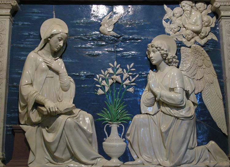 a) L'annunciazione è considerata il capolavoro di Andrea. A sinistra la Vergine seduta in atteggiamento di umiltà; a destra l'Arcangelo Gabriele genuflesso con soave espressione sul volto; al centro un vaso di gigli; sopra una colomba che rappresenta lo Spirito Santo e ancora sopra l'Angelo, l'Eterno Padre, circondato dalle teste di sei Cherubini. Sulla base tra gli stemmi della famiglia Nicolini è scritto:"Eccie Ancilla Domini Fiat Mihi Secundum Verbum Tuum."