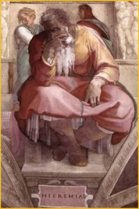 Le vicende umane di Geremia sono strettamente legate alle vicende politiche. Egli viene un secolo dopo Isaia. Come Isaia è costretto a soffrire a causa delle incomprensioni, delle alleanze dei vari re non conformi alla volontà di Dio e politicamente dissennate. La riforma di Giosia con la conseguente ricostituzione del regno di Giuda aveva suscitato in lui molte speranze, stroncate dalla morte del re a Meghiddo nel 609. Contribuisce allo suo sconforto la scomparsa del re, lo sconvolgimento del mondo orientale, la caduta di Ninive nel 612 con l’espansione dei Caldei. Nabucodonosor impone il suo dominio nella Palestina . Dopo la ribellione di Giuda, su istigazione dell’Egitto, egli conquista Gerusalemme e deporta una parte della popolazione. La seconda rivolta conduce nuovamente a Gerusalemme nel 587 Nabucodonosor che incendia il tempio distruggendolo e si realizza la seconda deportazione. Geremia durante queste vicende predica, minaccia, predice la rovina avvertendo invano i re che si succedono sul trono di David. Per questo motivo viene accusato di disfattismo dai militari, perseguitato e incarcerato. Nabucodonosor nomina governatore Godolia. Geremia preferisce restare in Palestina presso Godolia, che subito dopo verrà assassinato. Molti fuggono in Egitto, vi trascinano anche Geremia, dove probabilmente muore. Egli è sensibile ed è fatto per amare. Ma deve agire in contrasto con la sua anima. Mentre vuole amare deve predire rovine e sventure. Ama la pace e deve lottare contro tutti: re, sacerdoti, profeti, falsi profeti, popolo. E’ lacerato dalla missione che deve compiere e da cui vuole sottrarsi senza poterlo fare: “Perché il mio dolore è senza fine”. A suo tempo Giobbe dirà: “ Maledetto il giorno in cui nacqui”. La sofferenza ha portato Geremia a purificare la sua anima portandola a contatto col divino. Pratica la religione interiore e cordiale. Approfondisce nel cuore degli uomini l’azione di Dio che rende a ciascuno secondo le proprie azioni. Insegna che si rompe l’amicizia con Dio a causa del peccato che esce dal cuore malvagio. Propugna una nuova alleanza fondata sulla religione del cuore. E’ un uomo pratico e saggio, esorta i deportati a sposare, a generare figli, a comprare campi e a costruire case, affinché vivano bene anche nel periodo della sofferenza qual è l’esilio. Forse Geremia può essere l’uomo del nostro tempo, il quale vivendo lontano da Dio soffre e nel contempo si accosterebbe a lui partendo dal proprio cuore.